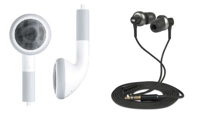 Apples ubiquitous earbuds (left) vs RBH's EP1 in-ear headphones (right).